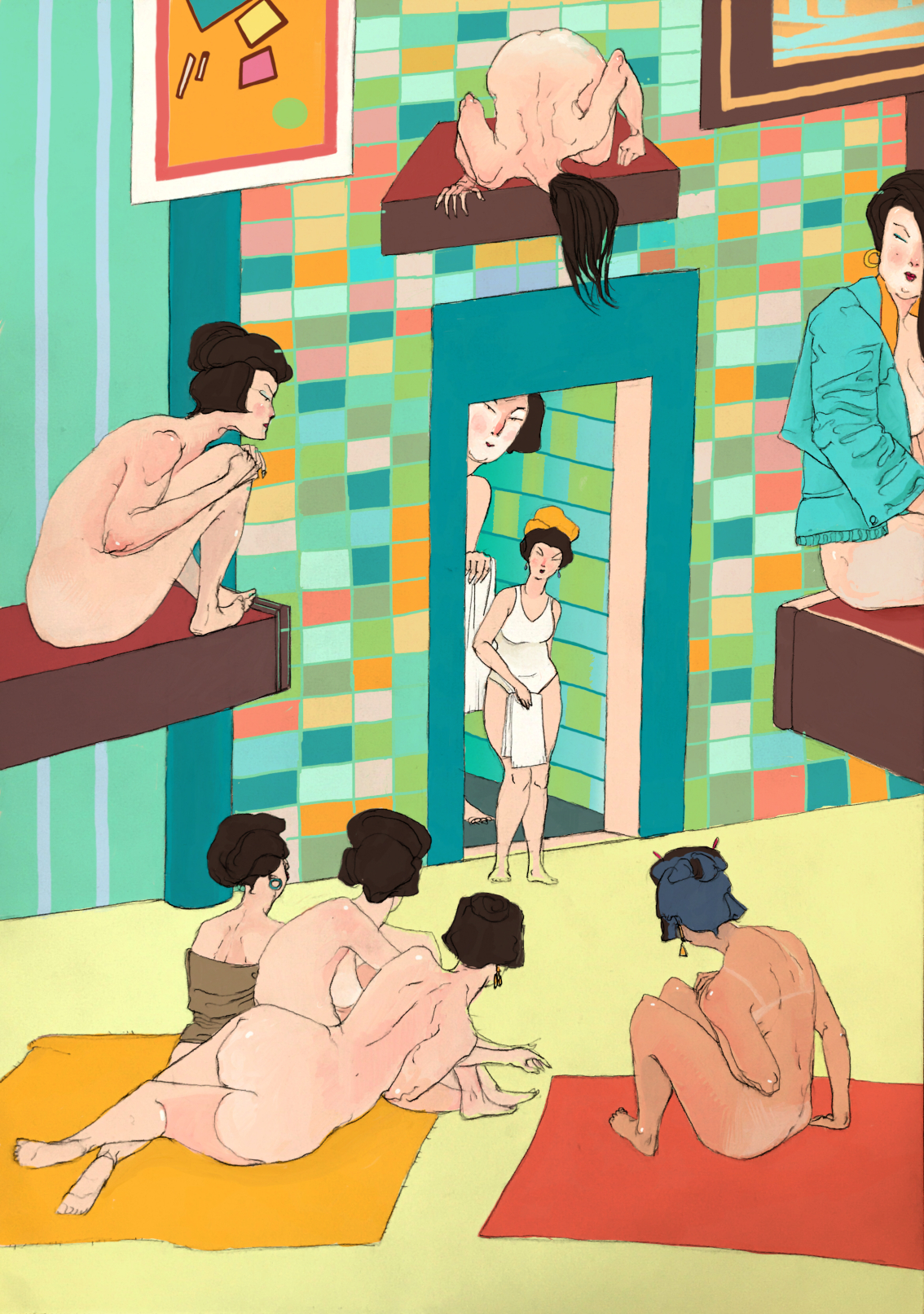 La toilette des geishas (crayon sur papier et couleurs numériques, 2019)