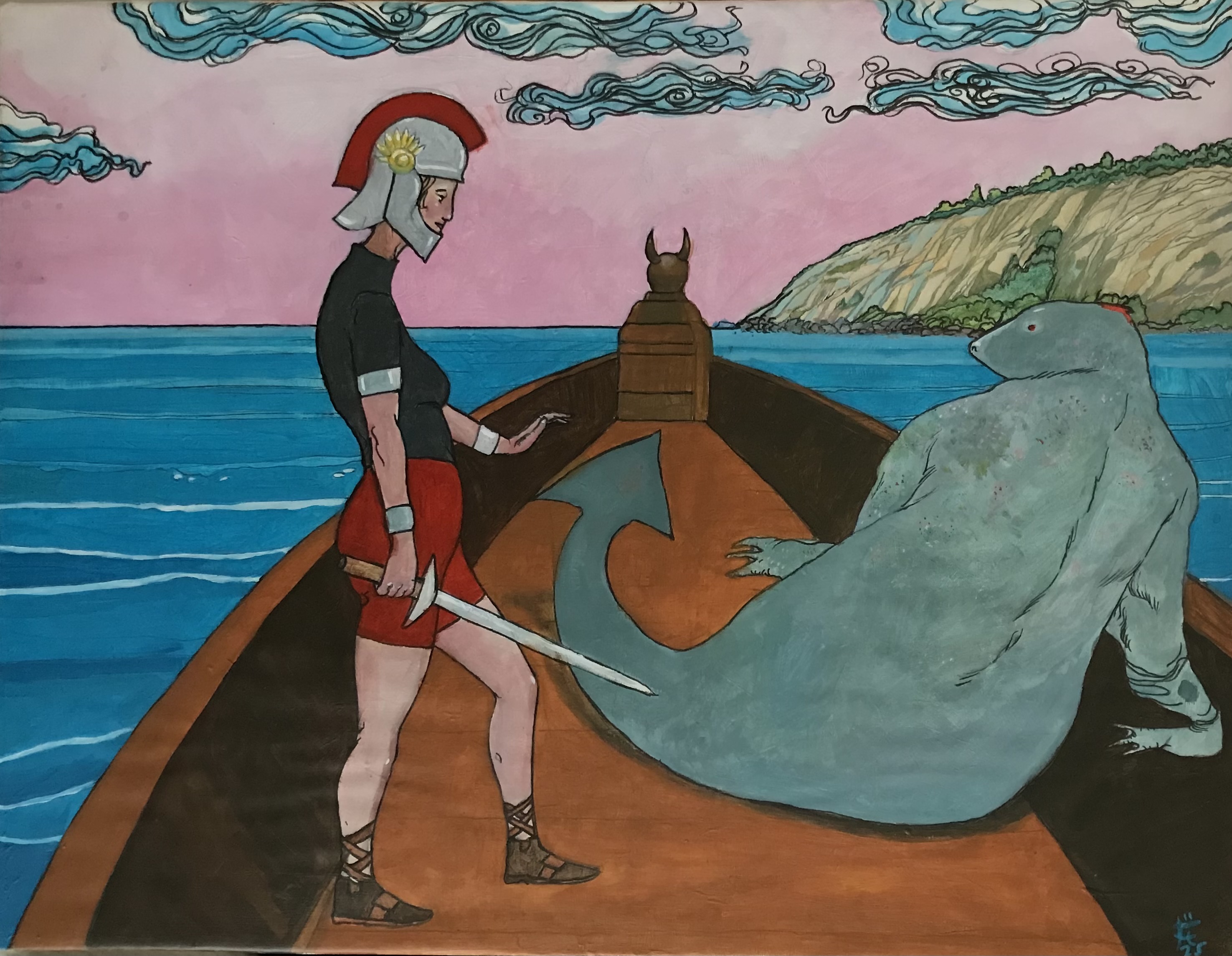 Dans un univers où le mythe et l’imaginaire se rencontrent, « La dame à l’épée » met en scène une guerrière résolue, casquée à la manière romaine, debout sur une barque, l’épée à la main, face à une créature marine énigmatique. Les lignes expressives et la palette subtilement nuancée, relevée de touches vives, traduisent une approche mêlant illustration et peinture.